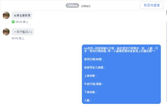 舉例狀況:客戶詢問官網行銷活動,但總人數超出最大車款,也未告知出發地點